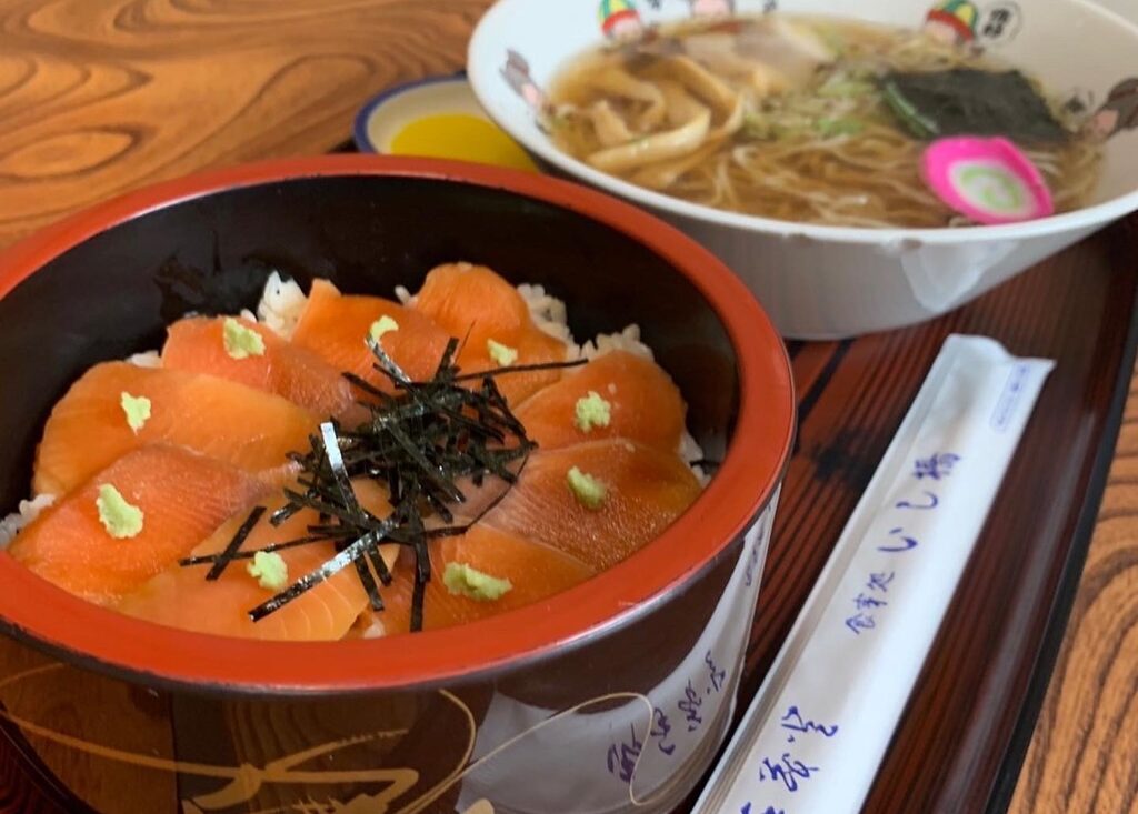 人気シリーズ「ちび丼セット」の中でもイチオシなのがちびサケ鉄火丼セット。鮭は地元産ものを使い、ルイベにして自前のタレで軽く漬けています。温かいご飯の上に乗せることで、ルイベが溶けてちょうどよい食感に!ラーメンもついてボリューム満点です!