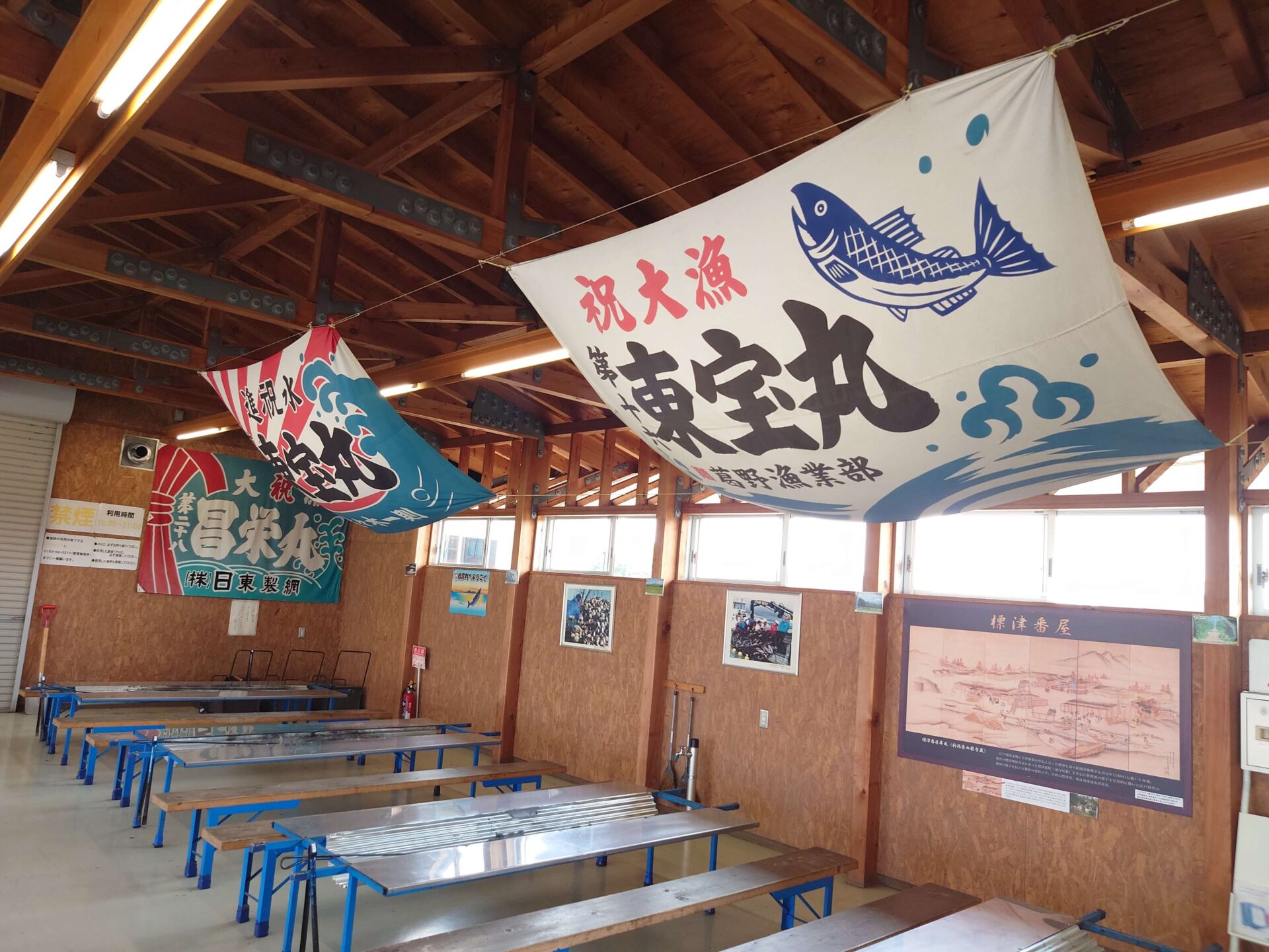 「番屋」とは元々、鮭漁などの漁夫の泊まる小屋・休憩所として使われる施設で、標津番屋内にもたくさんの大漁旗が飾られています。
